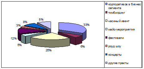 В 2008 году портфель реализованных агентствами проектов состоял из корпоративных мероприятий (33%), частных ивентов (25%), фестивалей (12%) и других мероприятий. Хочется отметить, что направление MICE-проекты заняло 5% всех проектов, реализованных агентствами-респондентами на протяжении года.