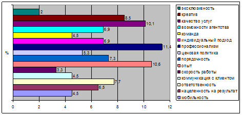 Среди ключевых преимуществ агентства в 2009 году выделили «профессионализм», «опыт» и «качество предоставляемых услуг». В 2008 году основными критериями успеха были «возможности агентства», «команда», «креатив» и «опыт». Таким образом, кризис показал, что рынок сейчас сконцентрирован на качественных и эффективных проектах.