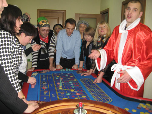 Мы организуем шоу азарта в любом помещении: от квартиры до загородного ресторана! В зависимости от количества игроков, выездное фан-казино «работает» уже при заказе одного игрового стола, для которого потребуется не более 6 м.кв. свободной площади. А если вам нужно увлечь компанию из 200 человек, и в этом случае выездное фан-казино справится с поставленной задачей. А задача во время новогодней вечеринки одна – чтобы всем присутствующим было весело и интересно!